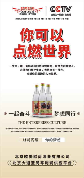 2017年12月18日10频道首播之后,将在中央电视台1频道、2频道、3频道、7频道、9频道、11频道、12频道、13频道、15频道共计十个频道持续投放广告,此轮央视广告总投放时间为2017-2022年,为期6年。此举在光瓶酒行业可谓重磅投入。由此可见,欧美欧尚北京革命小酒全力进军白酒市场的必胜决心与作战实力。